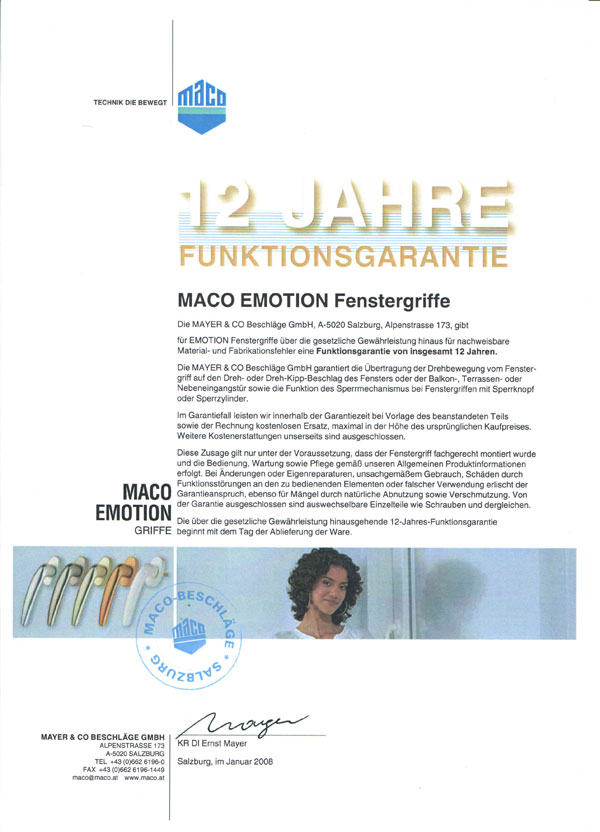 В 2007 году МАСО отпраздновало свой 60-ти летний юбилей. При этом все "игроки оконного рынка" смогли убедиться, что сегодня, как и 60 лет назад, фирма Mayer & Co. в Зальцбурге продолжает выпускать высококачественную фурнитуру для окон и дверей.